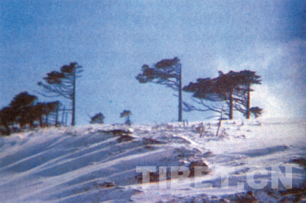 旗形樹是多雄拉山口的標(biāo)志性景觀。迎風(fēng)一面樹干光裸,是因每當(dāng)新枝嫩芽生發(fā),不待長(zhǎng)大,必被風(fēng)雪摧折,致使枝葉只在背風(fēng)一側(cè)生長(zhǎng)。