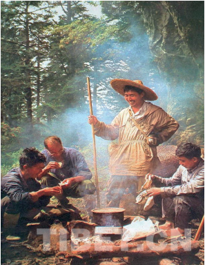 考察隊(duì)員在林間的宿營(yíng)地做早餐