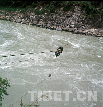 過溜索:上行和下行的索道上有人同時過江