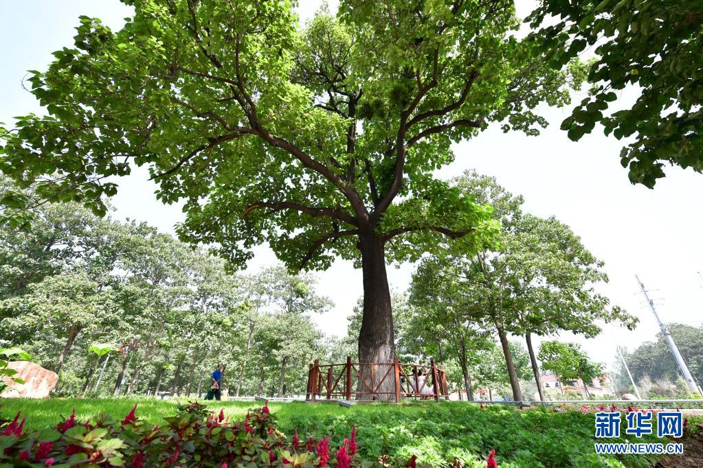 在河南蘭考縣焦裕祿干部學(xué)院門口,游客從“焦桐”下走過(guò)(2017年8月9日攝)。新華社記者 馮大鵬 攝