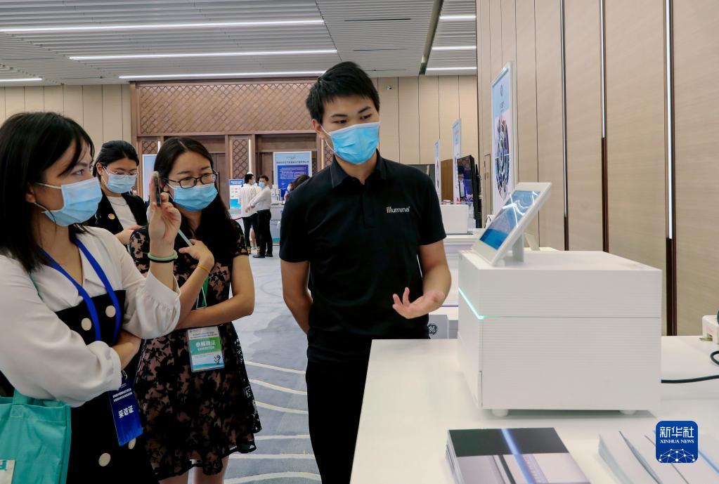 在國(guó)家會(huì)展中心(上海),第四屆進(jìn)博會(huì)食品及農(nóng)產(chǎn)品展區(qū)、醫(yī)療器械及醫(yī)藥保健展區(qū)展前供需對(duì)接會(huì)的工作人員在介紹一臺(tái)測(cè)序儀展品(7月26日攝)。新華社記者 方喆 攝