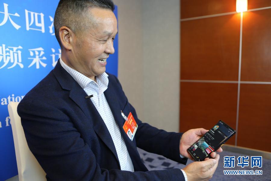 3月3日,全國(guó)人大代表、福建永泰縣希安油茶專業(yè)合作社負(fù)責(zé)人盧玉勝在駐地接受采訪時(shí)展示他為宣傳油茶開(kāi)通的社交媒體賬號(hào)。新華社記者 吳雨 攝