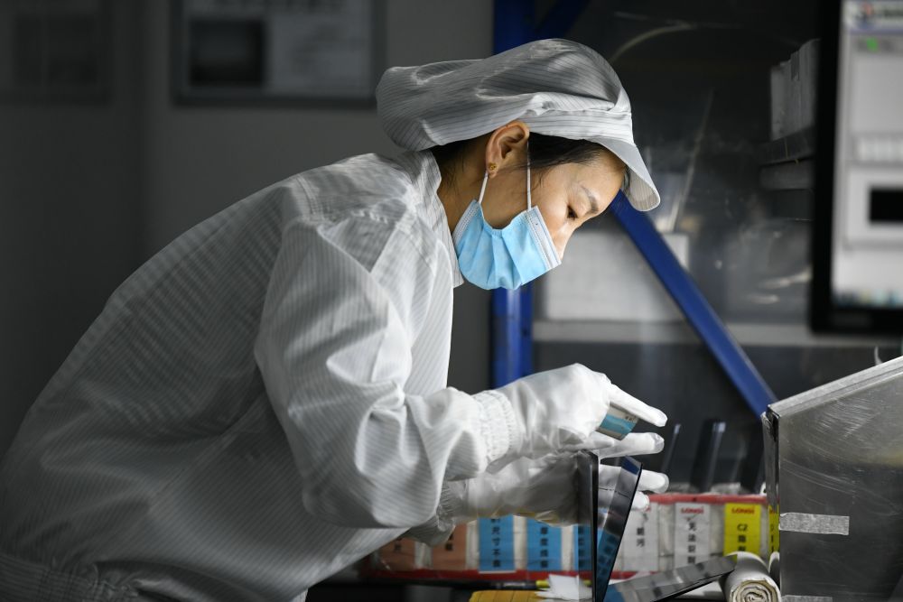 1月18日,在隆基綠能科技股份有限公司西安切片工廠,工人在生產(chǎn)線上作業(yè)。