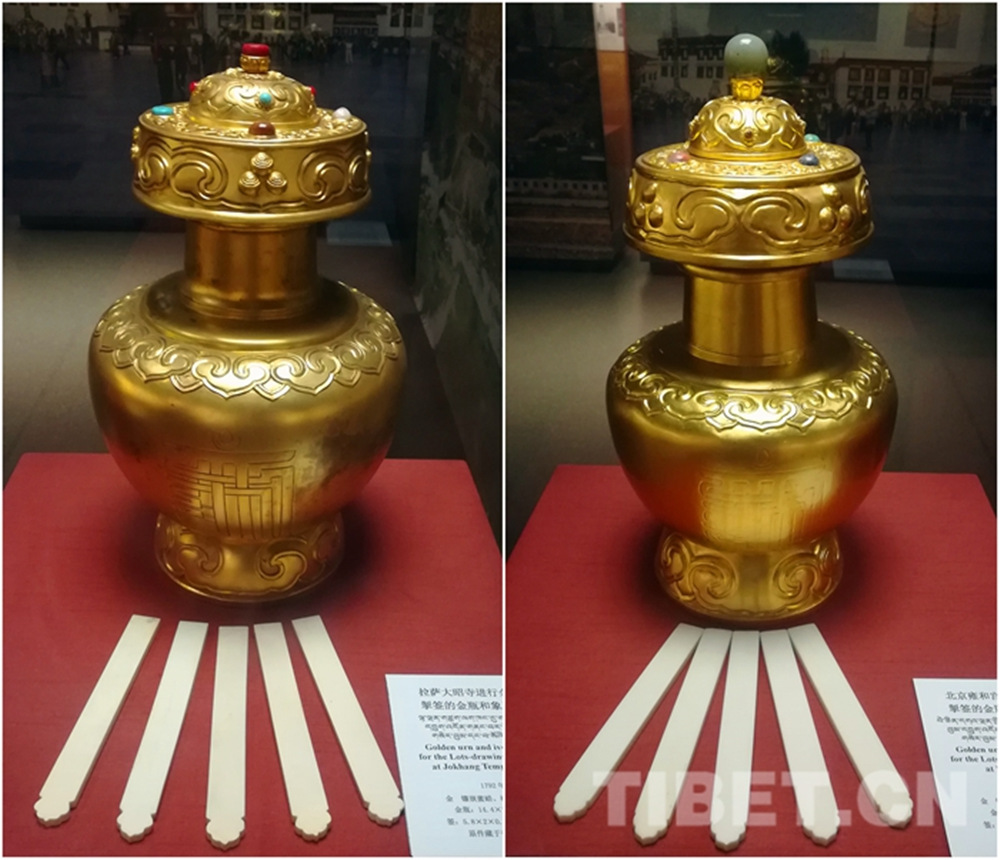 圖左為大昭寺進行金瓶掣簽的金瓶和象牙簽(復(fù)制品),圖右為雍和宮進行金瓶掣簽的金瓶和象牙簽(復(fù)制品)攝影:李元梅