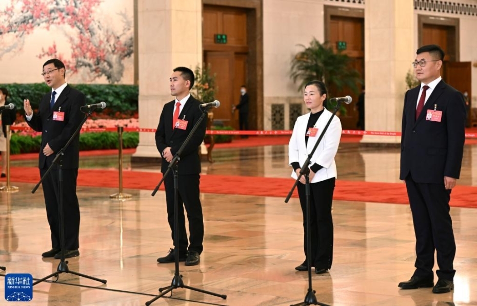 10月22日,中國(guó)共產(chǎn)黨第二十次全國(guó)代表大會(huì)閉幕會(huì)在北京人民大會(huì)堂舉行。這是閉幕會(huì)后,周海江、李國(guó)璋、張燕、施金通代表(自左至右)接受采訪。新華社記者 金良快 攝 圖片來源:新華網(wǎng)