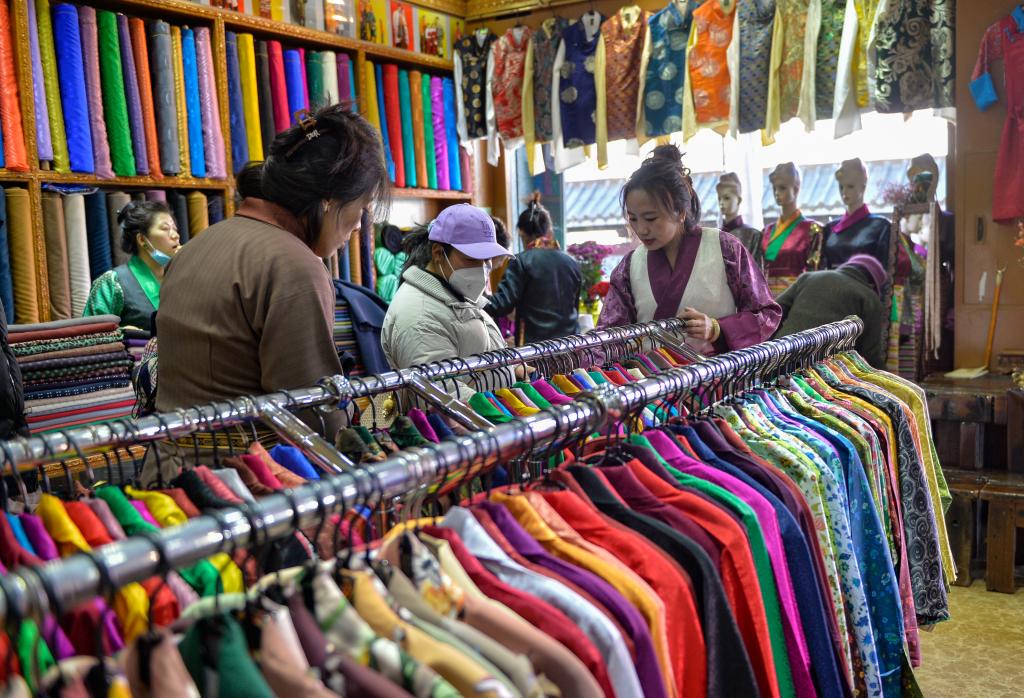 記者看到,古城大街小巷置辦年貨的人群摩肩接踵,市場(chǎng)上酥油、“卡塞”、人參果、五彩青稞穗等藏族傳統(tǒng)年貨應(yīng)有盡有,來(lái)自祖國(guó)大江南北的特色產(chǎn)品豐富充裕。