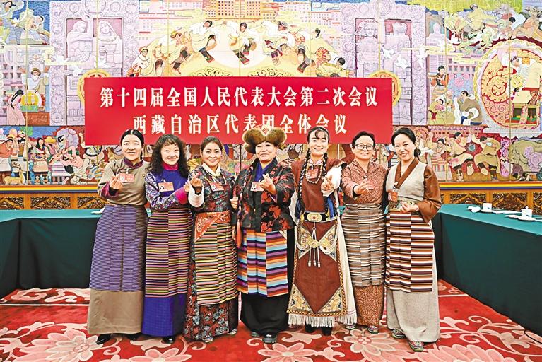 圖為西藏全國人大代表中的“七朵金花”在北京人民大會堂西藏廳合影留念,并祝福全區(qū)婦女同胞“三八”國際勞動?jì)D女節(jié)快樂。