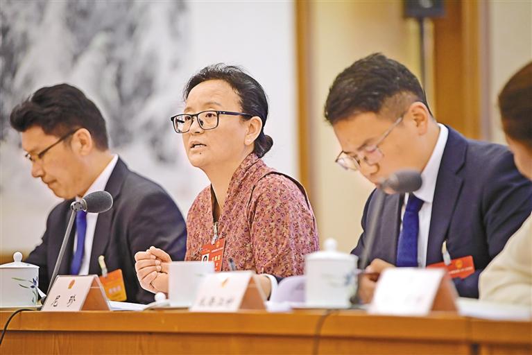圖為3月7日,西藏代表團(tuán)舉行全體會議,傳達(dá)學(xué)習(xí)習(xí)近平總書記在看望參加全國政協(xié)十四屆二次會議的民革、科技界、環(huán)境資源界委員并參加聯(lián)組會議時的重要講話,審議國務(wù)院組織法修訂草案,繼續(xù)審查計(jì)劃報(bào)告和草案、預(yù)算報(bào)告和草案。圖為尼珍代表在會上進(jìn)行討論發(fā)言。記者 旦增西旦 攝